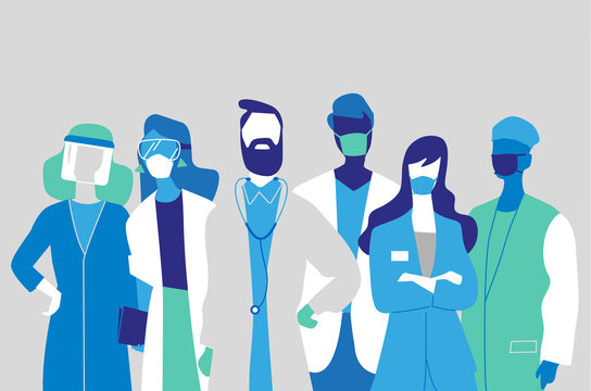 Squadra di medici e infermieri uomini e donne che indossano le mascherine