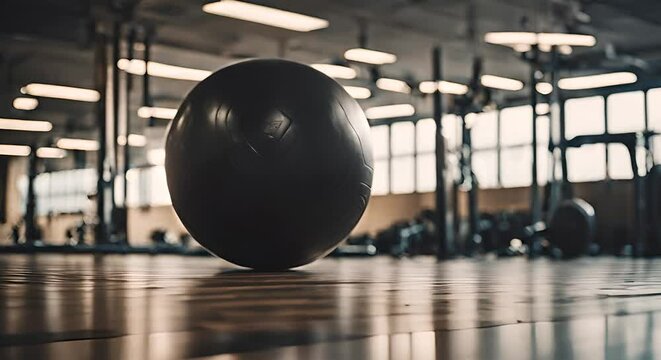 athletic guy at crossfit training jumps and throws medicine ball in the gym, strong man is doing fitness with ball