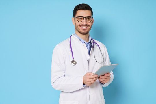 Young male doctor in white medical robe and eyeglasses, looking at camera with confident smile, holding tablet pc, isolated on blue background