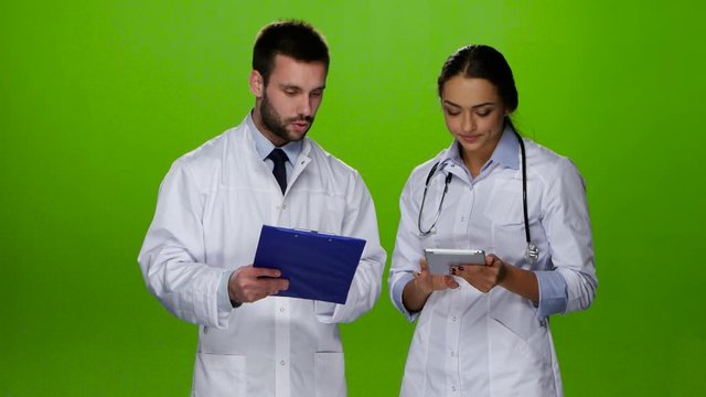 Paramedics discuss diagnosis of the patient. Green screen