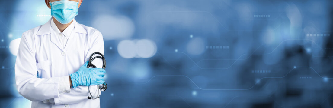 Doctor Man on blur hospital laboratory panoramic blue background. COVID-19 virus epidemic outbreak to Coronavirus pandemic disease global recession wide concept for social scientist vaccine