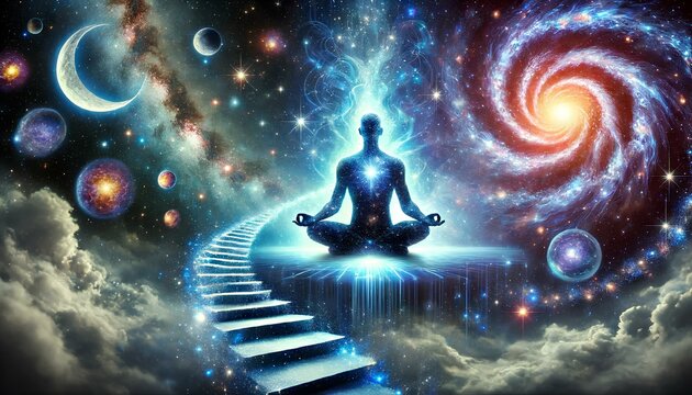Spiritual awakening in the cosmic expanse. An astral human form is depicted in a meditative pose against a cosmic backdrop