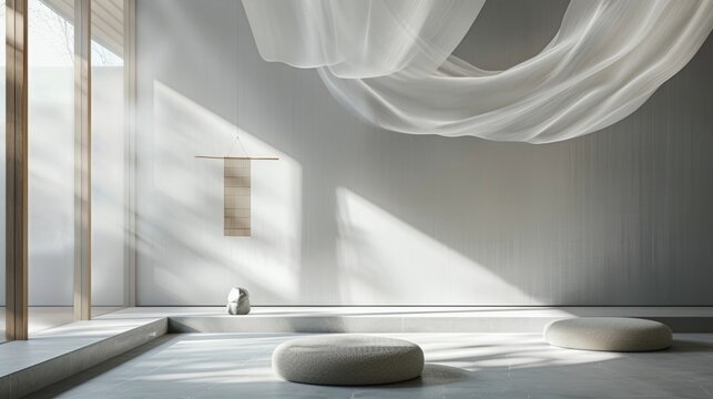 A single piece of fabric floats above a minimalist meditation space creating a serene and dreamy atmosphere for quiet contemplation.
