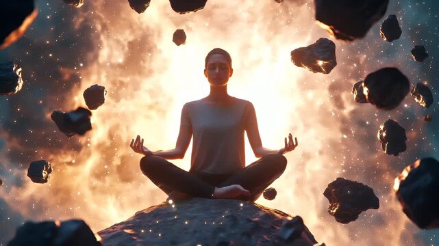 Fitness. Exercise. New Year resolution. Healthy lifestyle theme. woman meditating in lotus position against cosmic backdrop with asteroids and nebulous formations.
