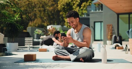 Yoga, texting and man outdoors with phone, smile and meditation for wellness. Happy person, fitness blog and relaxation in garden with people, online mindfulness and technology for social media