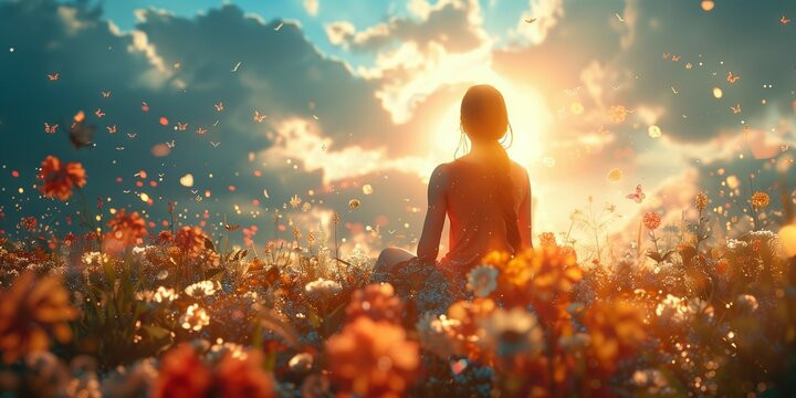 A serene scene depicting a person meditating at sunset, symbolizing tranquility and mindfulness, This image is perfect for wellness, yoga, or meditation-related content,