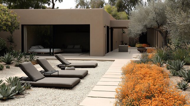Serene meditation center built with clay architecture and natural materials is surrounded by gardens fostering tranquility and sustainable living