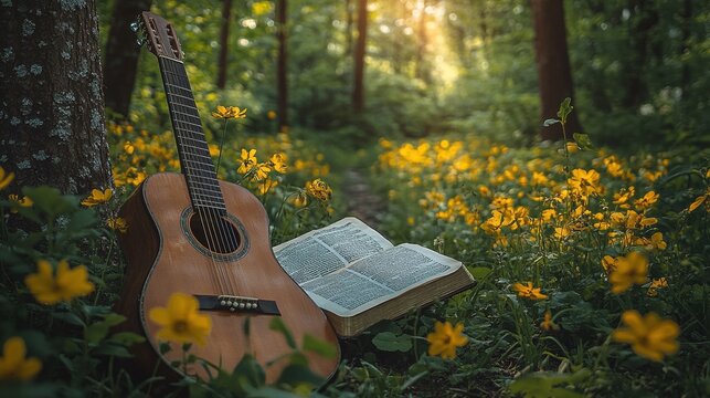 peaceful garden gathering for a christian family worship session emphasizing the importance of guitar music and bible reading in their faith