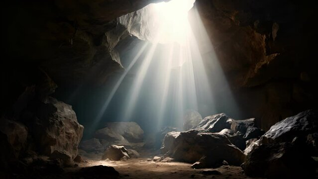 Concept photo of a dark and gloomy cave, representing the eleventh station Jesus is nailed to the cross. A single ray of sunlight breaks through the clouds and illuminates the spot where