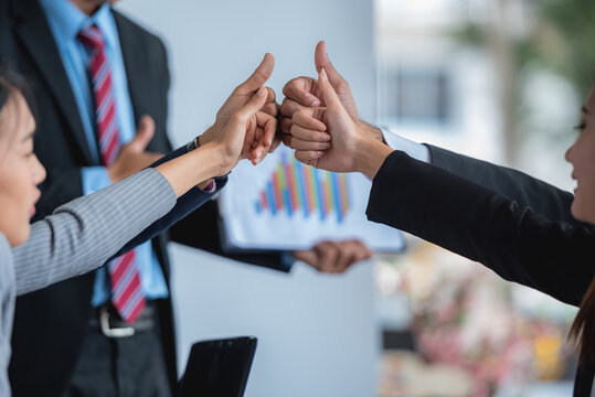 Close up business thumbs up sign on blurred background of business people s hands gesturing like