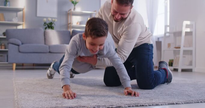 Father and son sporty day helping happy boy child practicing exercise doing push ups, working out, enjoy activity games at home, healthy fit lifestyle, learning, developing, happy Father Day sport fun