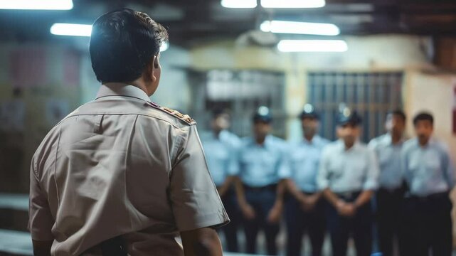 Officer in uniform addressing police personnel from behind in briefing room. Security official giving instructions to team of officers during station meeting.