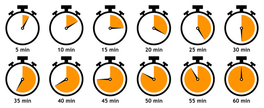Collection of stopwatch icons showing countdown times from 5 to 60 minutes with orange segments. Vector illustration.