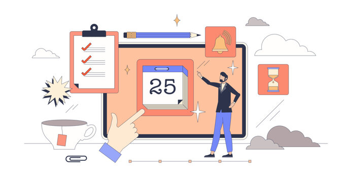Digital planner for online task reminders tiny person neubrutalism concept, transparent background. Use smart phone for effective task management with notifications and calendar illustration.