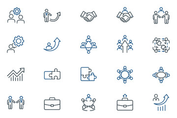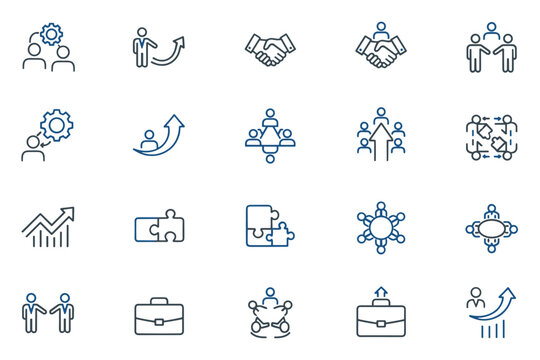 Business and partnership line icon set. Teamwork, collaboration, meeting, and growth concepts. Includes handshake, puzzle, career development, and strategy symbols. Corporate vector pack.