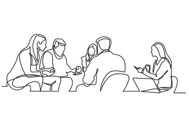 Continuous line group of people having business meeting at conference table using laptops Hand drawn art lines vector on transparent background.