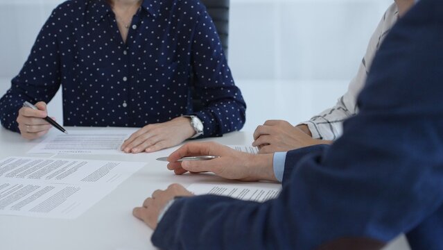 Business people reviewing contract during a meeting, pointing at specific clauses and discussing potential amendments before signing the agreement