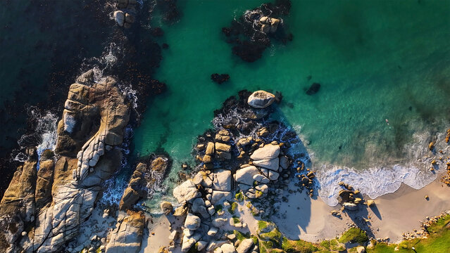 Aerial view of rugged, sun-kissed boulders meeting the turquoise ocean, while the shoreline whispers tales of time, Cape Town, Western Cape, South Africa.