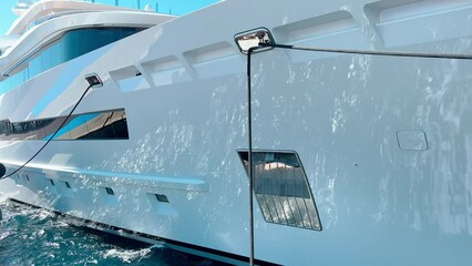 A huge motor yacht is moored in port at clear sunny weather, the chrome nose of a large megayacht