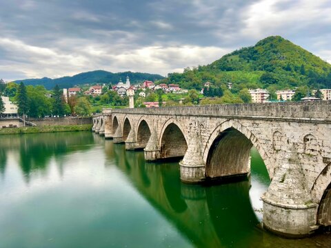 View in the Rainy Day to the historic Mehmed Paša Sokolović Bridge Bridge in Višegrad, over the Drina River, Bosnia and Herzegovina