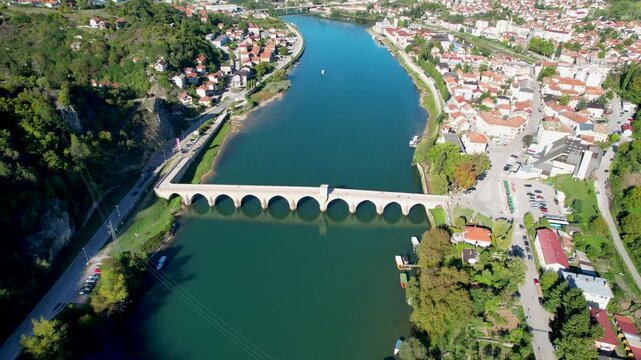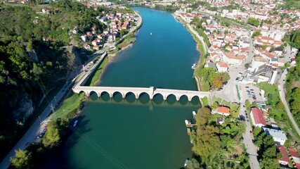 Aerial reveal of Mehmed Paša Sokolović Stone Bridge in Visegrad, Bosnia and Herzegovina, spanning the Drina River with surrounding town, houses, hills, and lush greenery in a scenic landscape view
