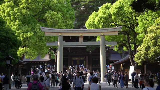 Tokyo, Japan: People walk through the Tori traditional gate toward the famous Meiji Jingu Shinto temple in the heart of Tokyo between Shibuya and Shinjuku. Shot as a time lapse video