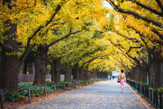 Woman in kimono walking along an avenue lined with ginkgo trees