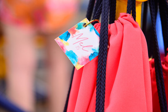 red bag with the name Mel, colorful card, paper card