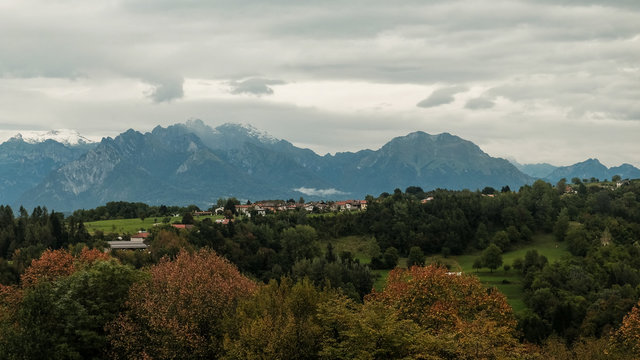 Dolomiti mountains panorama. Zumelle Castle, Mel, Belluno, Italy. August 2018