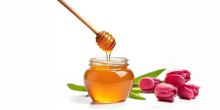 Pote de vidro com mel de abelha de flores de tulipa. Mel com colher meleira e ramos de tulipas ao fundo