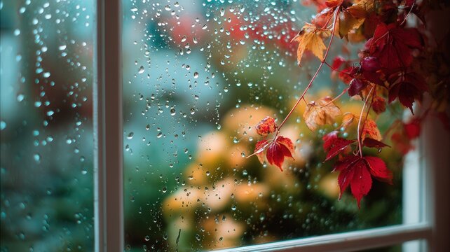 Raindrops trickling down glass surface, blurred golden red autumn leaves creating windowpane melancholic through seasonal ambiance
