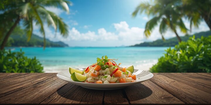 Raw fish salad with coconut milk served against lush island backdrop, highlighting Fiji's traditional cuisine and natural setting
