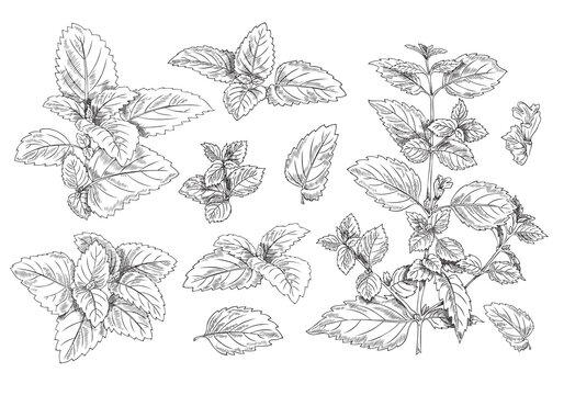 Peppermint sketch. Mint leaves branches and flowers vintage engraving. Hand drawn spearmint and melissa herbs. Culinary or medical aromatic plant twigs. Vector botanical elements set
