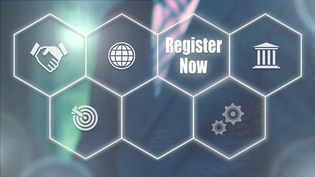 A businessman's hand selecting a Register Now concept button on a futuristic computer screen.