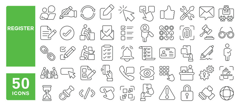 Set of 50 line icons related to register, sign up, signature, clipboard, checklist, compliance, pen, terms, agreement, membership, registration, Editable stroke. Vector illustration