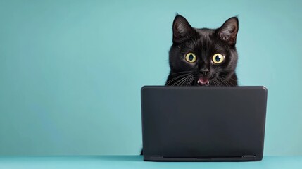Shocked Black Cat Staring at Laptop Screen, Funny Pet Meme Concept with Copy Space for Text, Hilarious Feline Expression