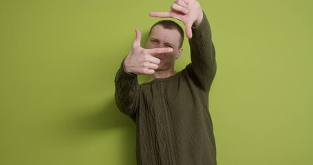 happy handsome man with hands on green background for creativity, meme or photo, guy man is looking through finger frames, male making frame with hands and fingers with happy face. photography concept