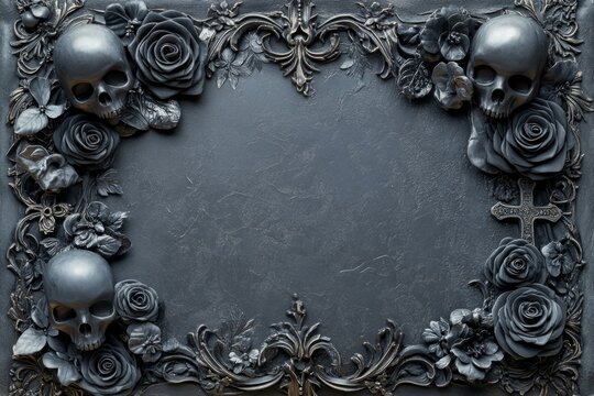 Intricate gothic frame adorned with skulls, roses, and cross evokes dark romanticism and memento mori themes