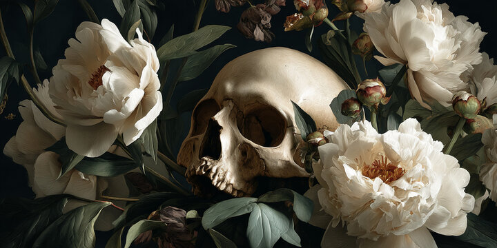 Human skull nestled amongst creamy white peonies and dark green leaves, creating a striking contrast of life and death, showcasing memento mori theme