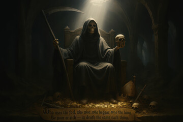 Death sits on throne in ark cathedral, holding skull and scythe above gold coins and royal insignia, under the verse: “Who was the fool, who wise, who beggar, who the king—be poor or rich, in death th