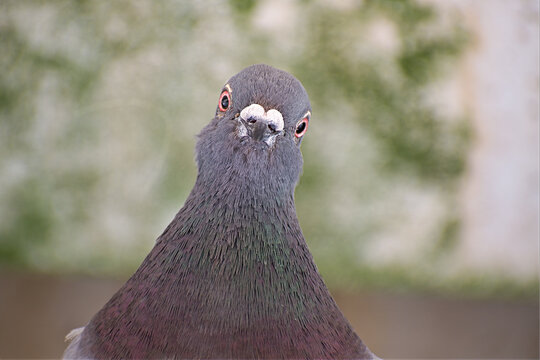 Charismatic pigeon picture looking straight to camera. A very charming and curious pigeon looks straight to camera with a softly lit and focused background.  Ideal copy space or meme picture.