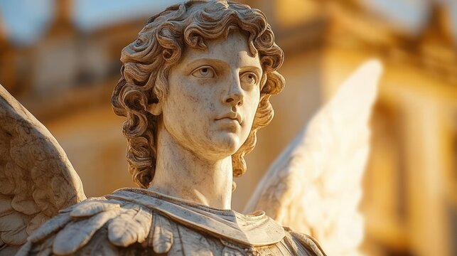 sunlit marble angel statue with detailed curly hair, sculpted wings and draped robes, serene and contemplative mood