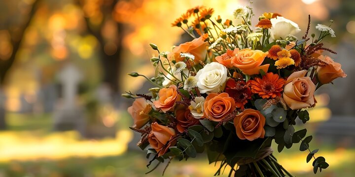 Bouquet of Flowers in a Cemetery: Symbolism of Funerals. Concept Cemetery Photography, Floral Arrangements, Funeral Traditions, Symbolic Imagery, Mourning and Remembrance