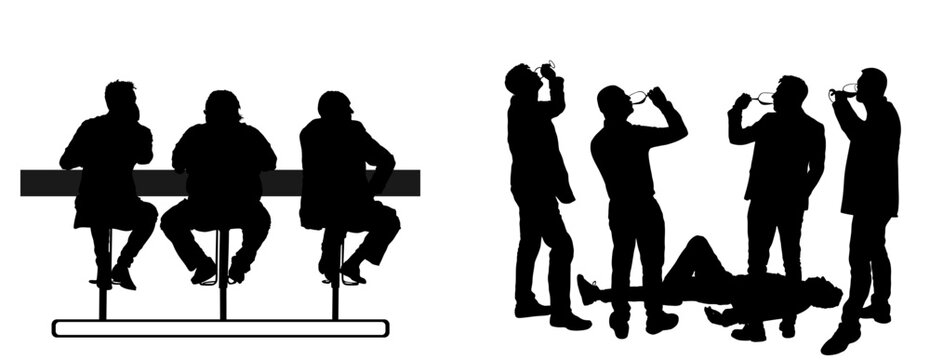 People sitting in bar drinking alcohol beverage vector silhouette illustration isolated. Crew party friends night life guests. Businessman crew meeting talk. Relaxation drunk man pass out lies down.