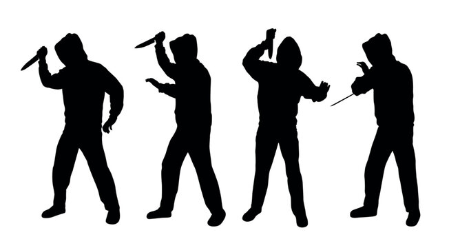 Vector silhouettes of a man in a hoodie holding knife attacking someone isolated on white background