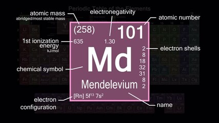Periodic table focusing on Mendelevium with properties, animation, 4K 30 fps