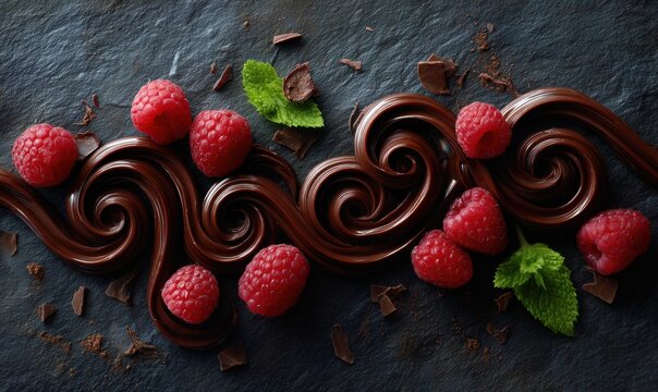 A chocolate swirl with raspberries and mint leaves
