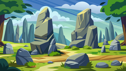 Vector art of majestic menhirs stand tall in a lush green field, creating a captivating landscape with scattered rocks and trees under a cloudy sky