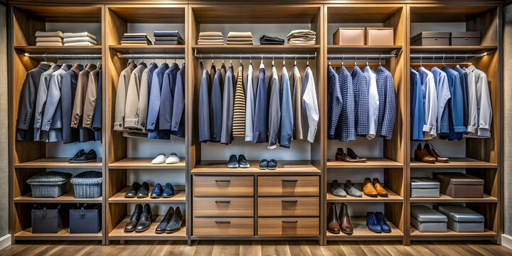 Neatly organized men's fashion collection in a well-lit wardrobe , fashion, menswear, suits, shirts, trousers, wardrobe