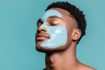 Skincare Ritual: A close-up portrait of a young man with dark skin, eyes closed, applying a cool blue face mask against a calming aqua backdrop.